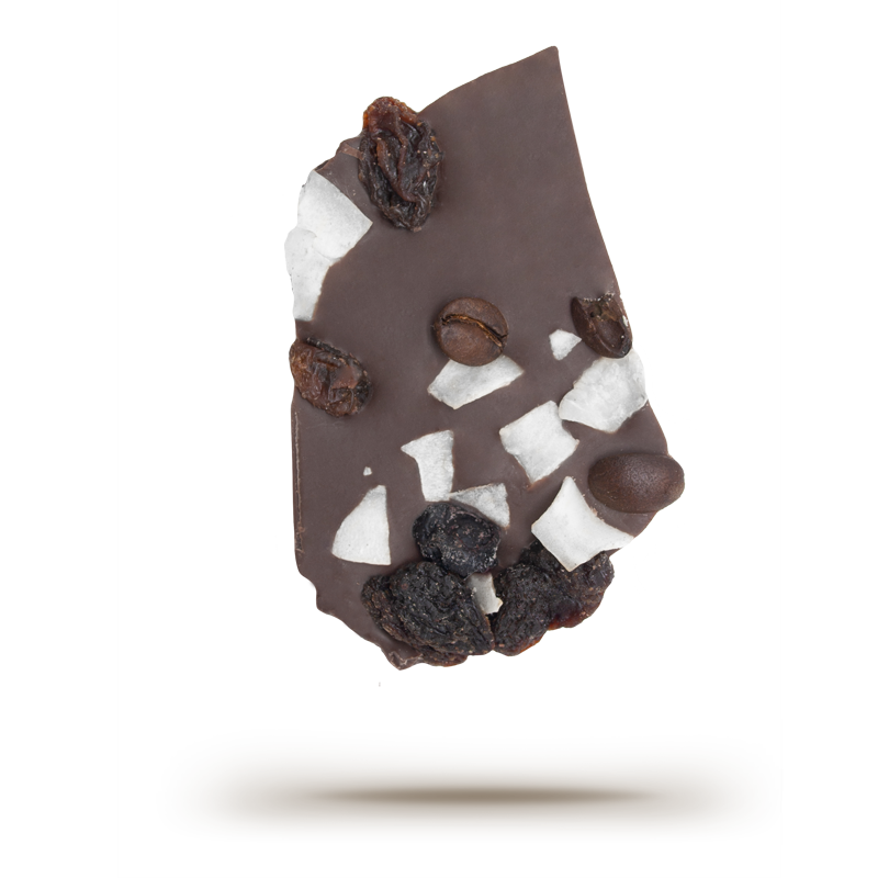 55% Cacao Chocolate with coconut, raisins, blueberries and coffee beans.