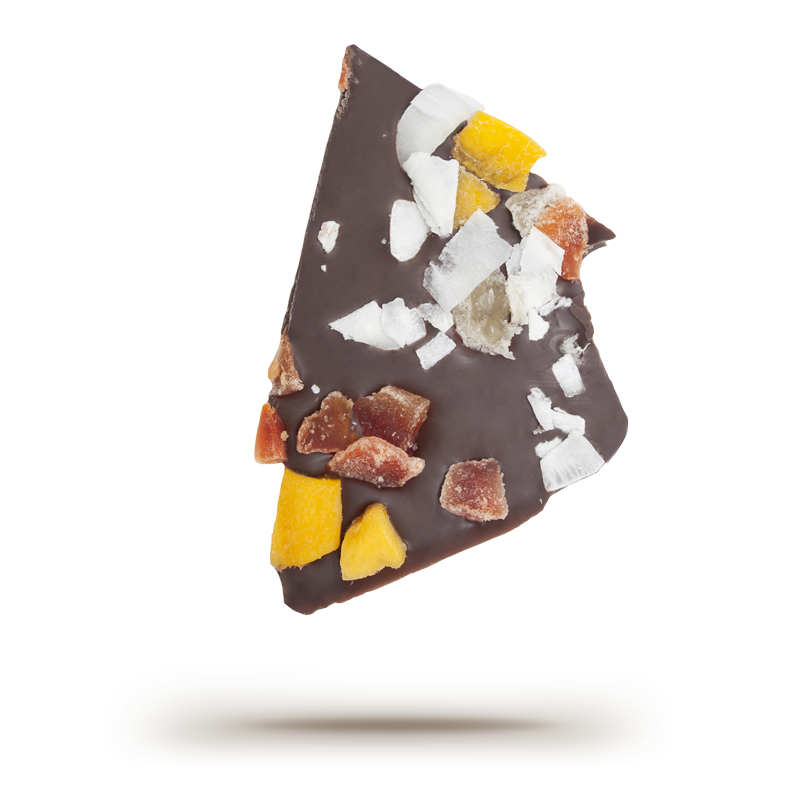 55% cacao chocolate with coconut, mango, papaya & pineapple.