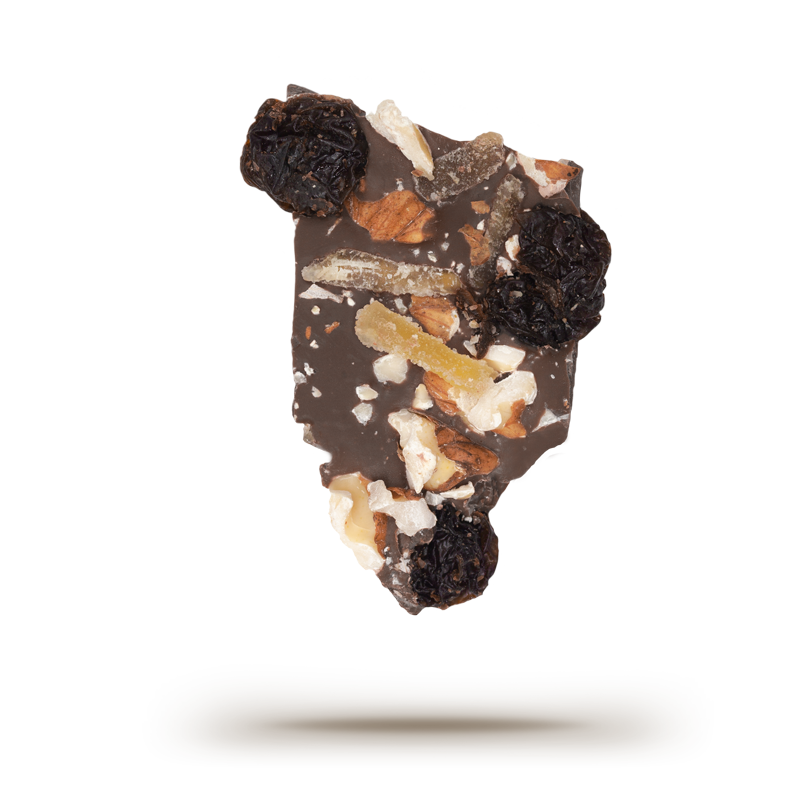 55% Cacao Chocolate with walnut, dried cherries & ginger