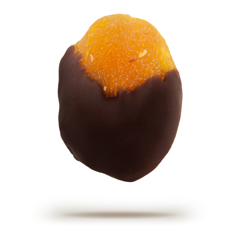 Dried apricots dipped in 55% cacao chocolate.