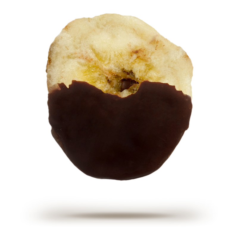 Sliced and dried bananas dipped in 55% cacao chocolate.