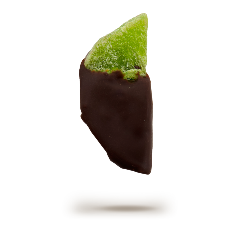 Crystallized kiwis dipped in 55% cacao chocolate.