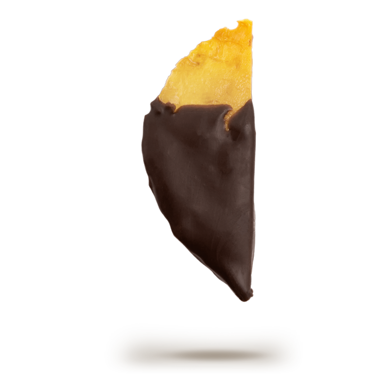 Sliced and dried mango dipped in 55% cacao chocolate.