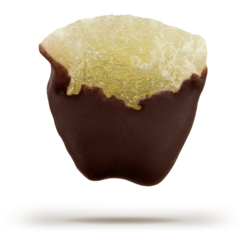 Crystallized ginger dipped in 55% cacao chocolate.